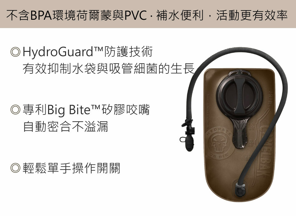 • HydroGuard™防護技術,有效抑制水袋與吸管細菌的生長。請注意此技術非氯水性能,無法過濾水源中的細菌