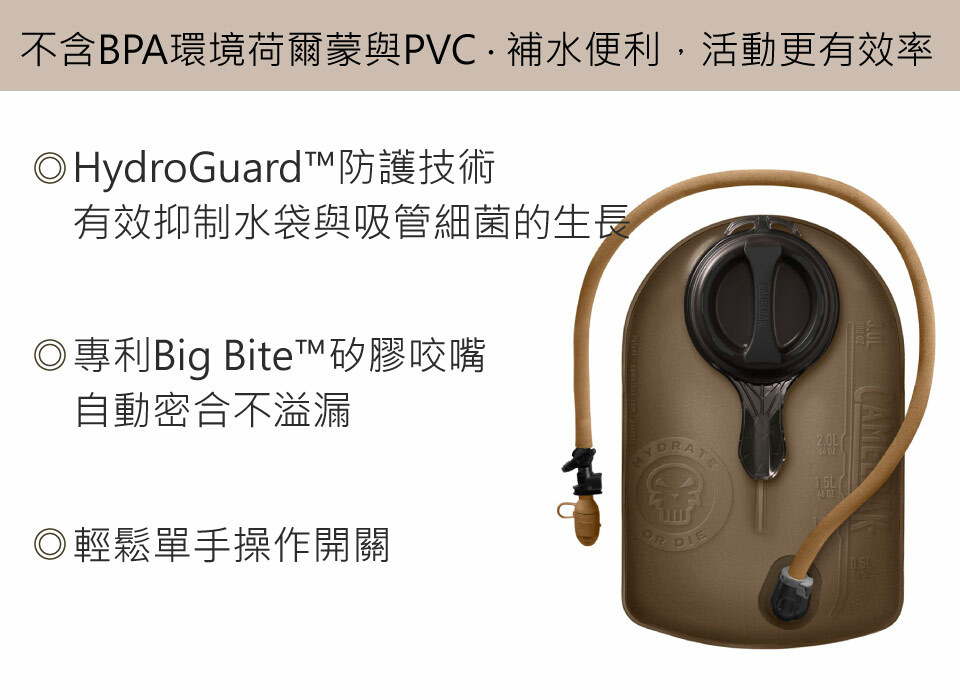 • HydroGuard™防護技術,有效抑制水袋與吸管細菌的生長。請注意此技術非氯水性能,無法過濾水源中的細菌