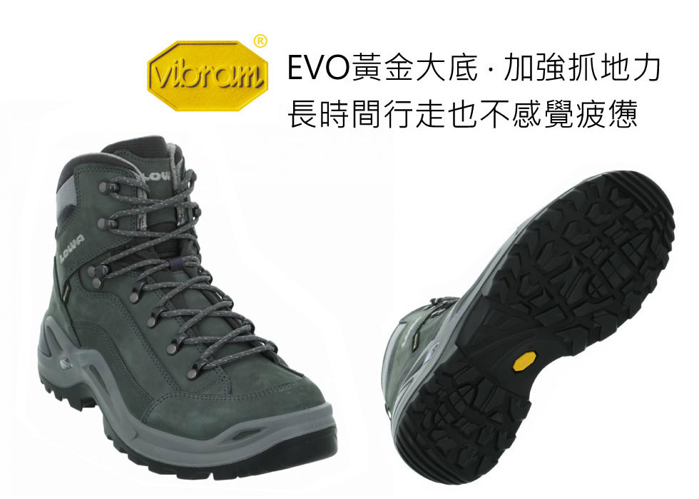 • 使用Vibram® EVO黃金大底,加強抓地力,給予行走間最佳的抓地力與穩定性,並提供了一定的緩衝,適合於多種環境中使用,長時間行走也不感覺疲憊。