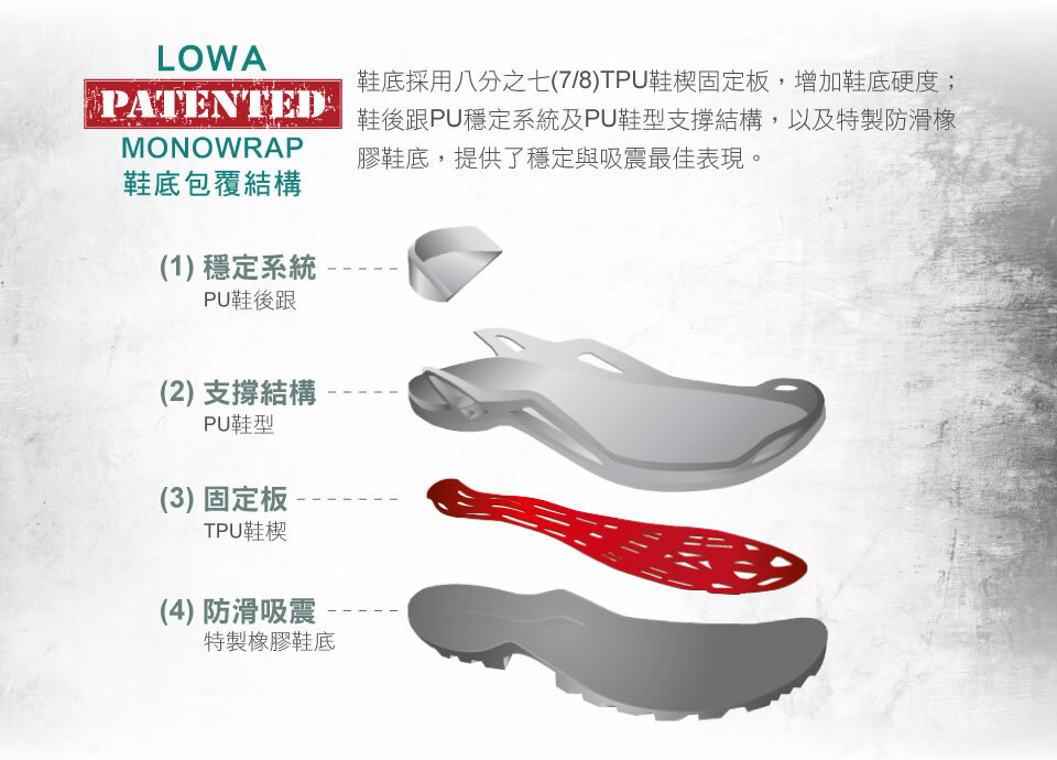 • LOWA專利 MONOWRAP®科技應用,TPU支撐片與PU射出中底提供更多的支撐性,降低行走間的負擔。
