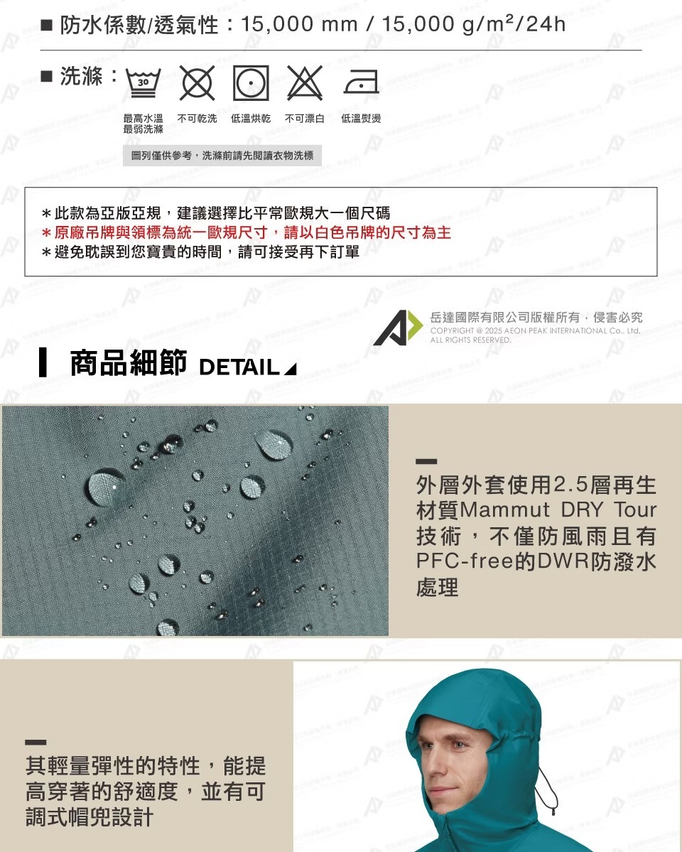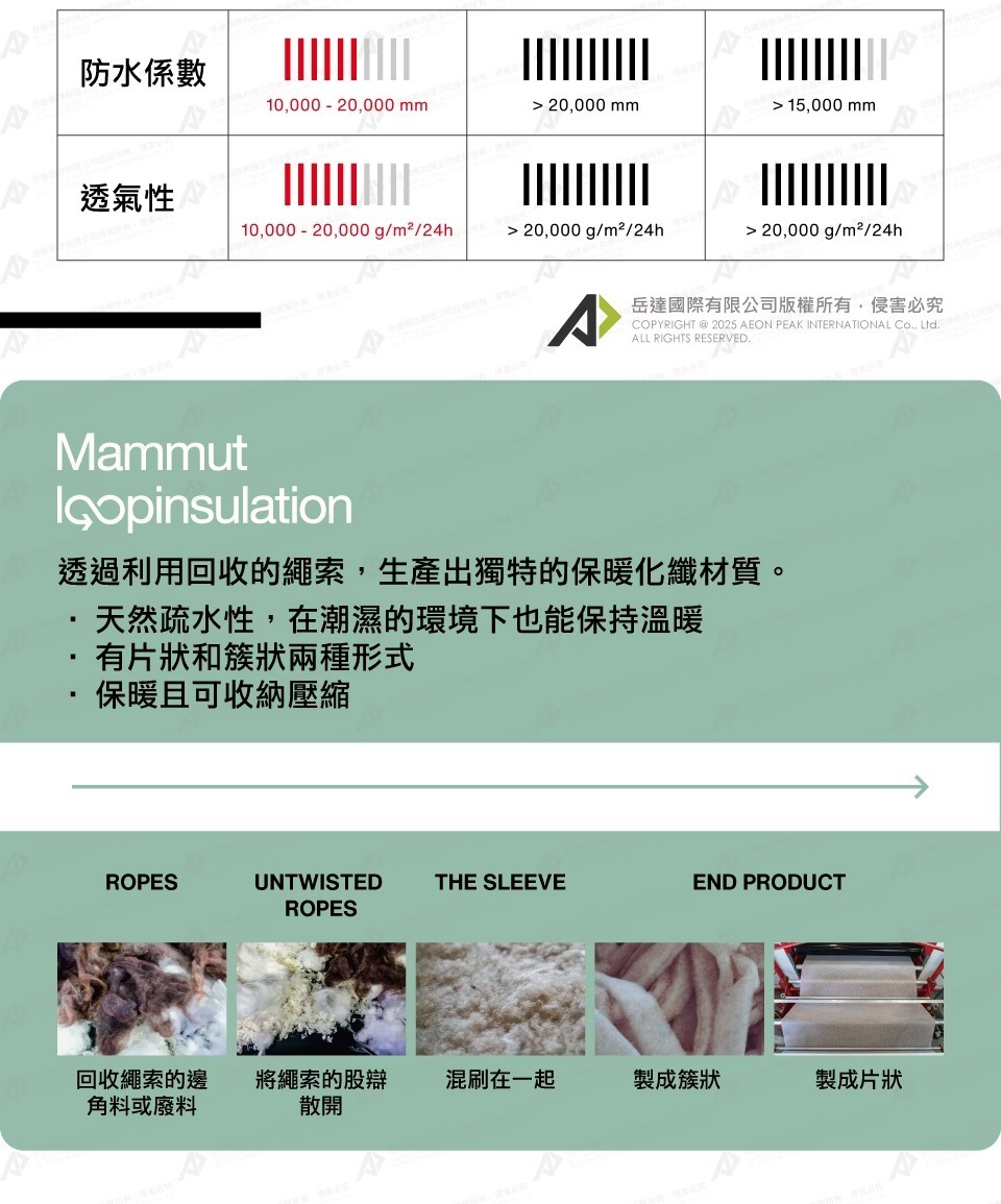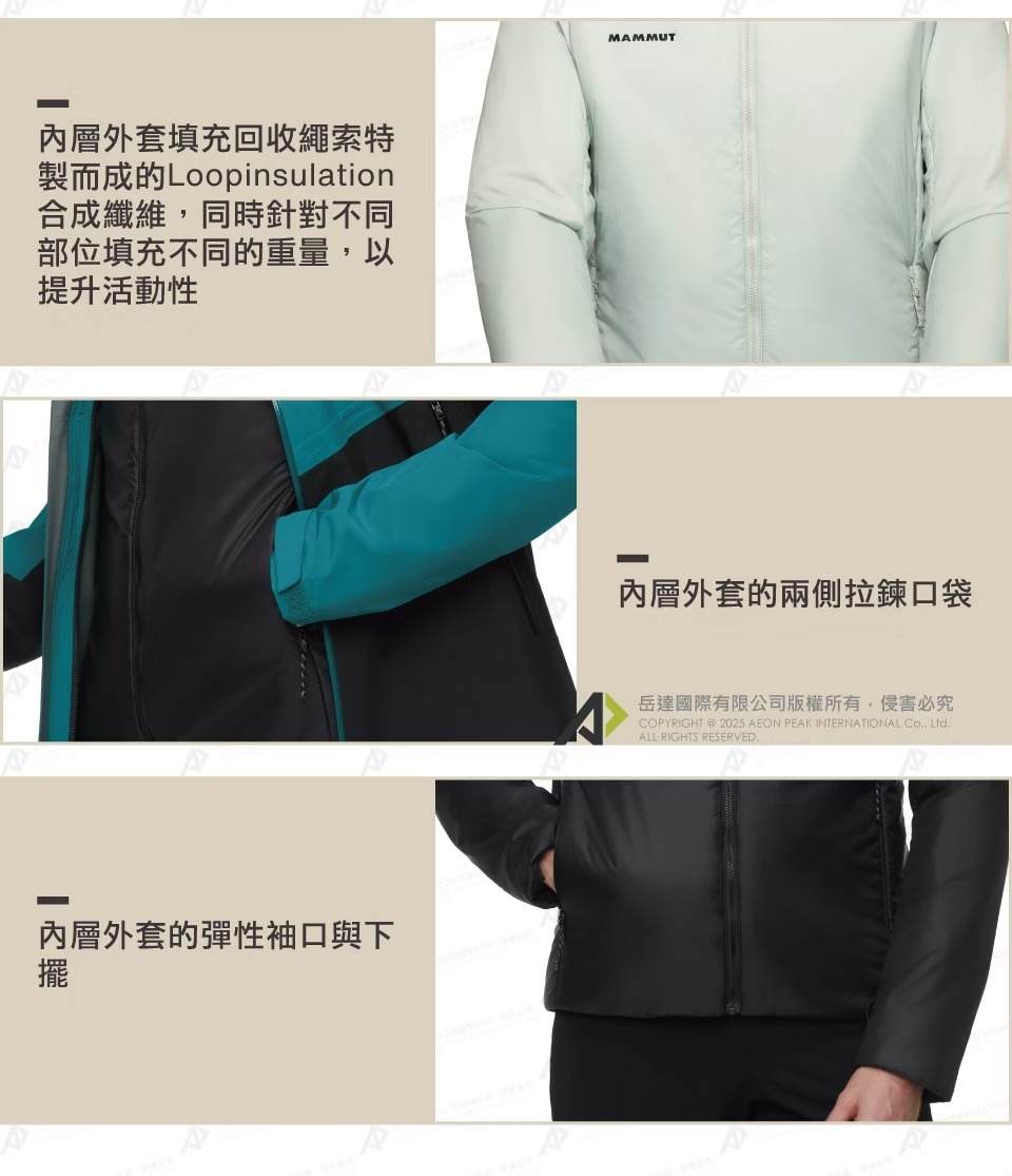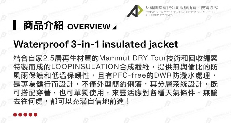 Alto Light 3 IN 1 結合自家2.5層再生材質的Mammut DRY Tour 技術和使用回收繩索再製而成的Loopinsulation科技,提供無與倫比的全方位防風雨保護和保暖,且有PFC-free的DWR防潑水處理,是專為健行而設計。