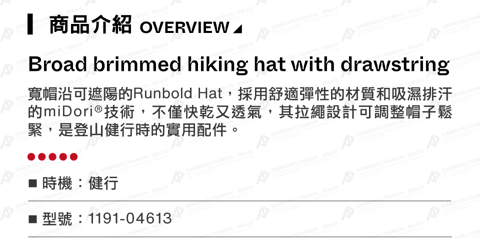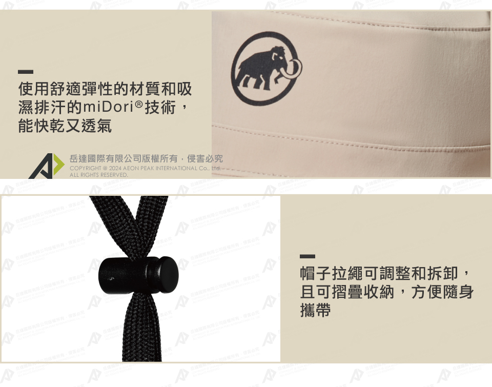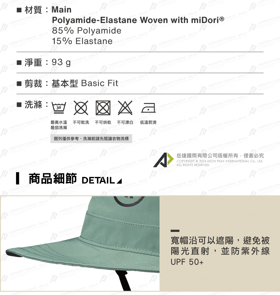 寬帽沿可以遮陽,能快乾又透氣,帽子拉繩可調整和拆卸。