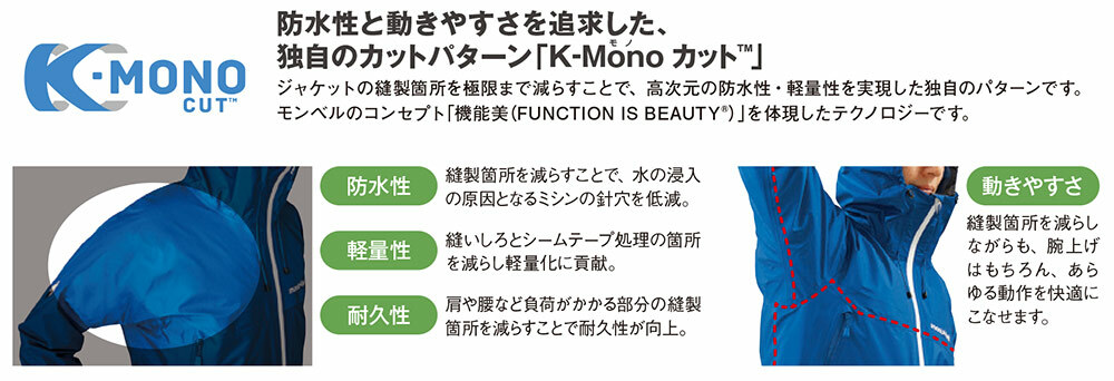 🔻採用K-Mono Cut,在同一塊布料上僅需進行單一的裁剪及車縫,可大幅減少超過50%的縫線使用,減少雨水可以滲透夾克的區域並降低重量。