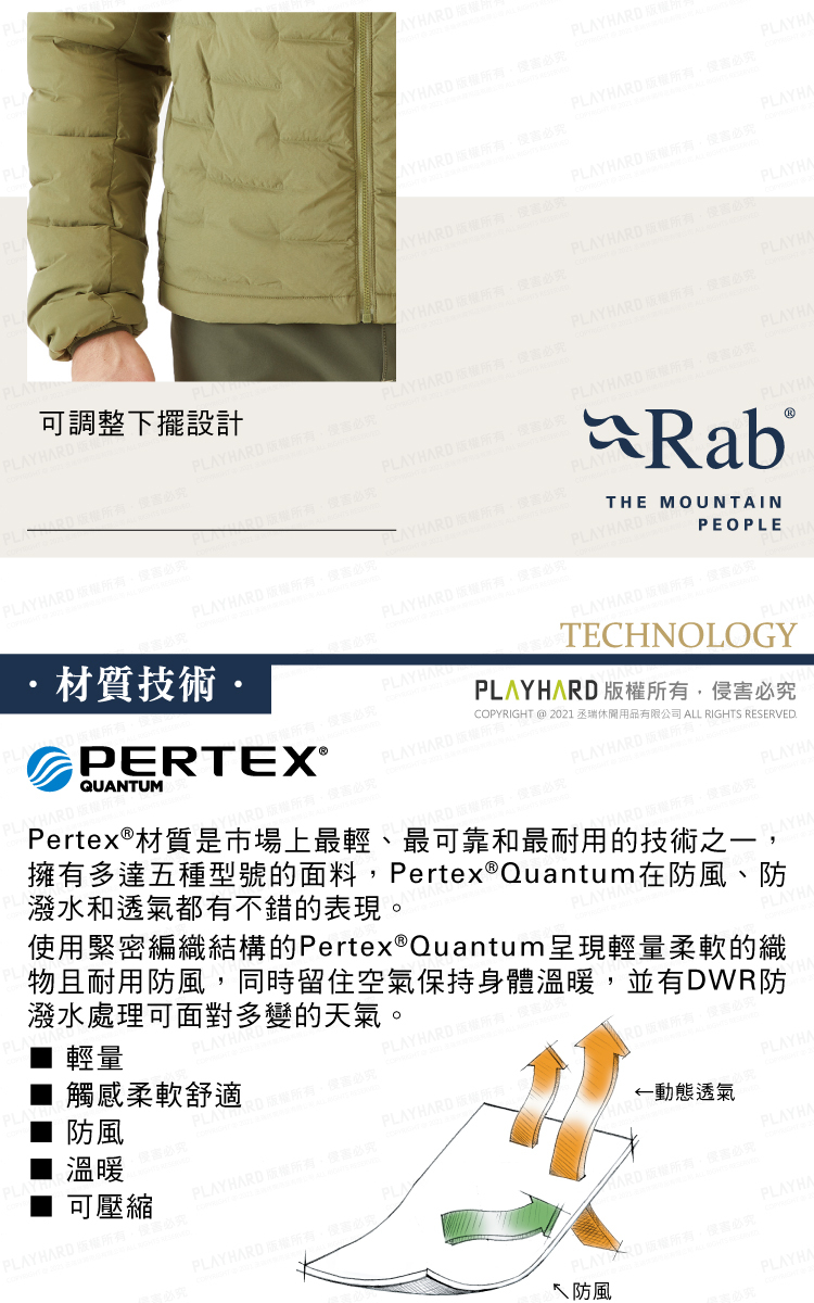 填充了 700FP PURE 再生羽絨,並採用先進的 Pertex®3D 編織技術製成,具有出色的抗風性、重量輕,提供最大限度地延展性。