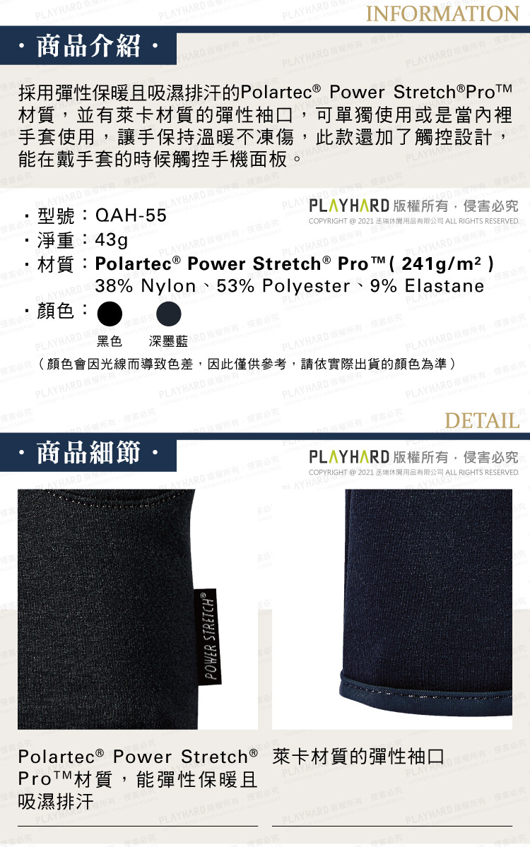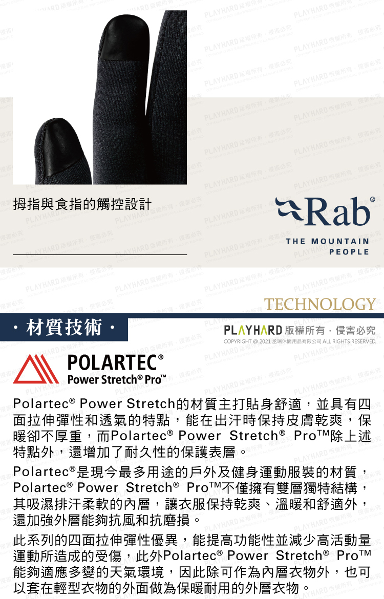 採用彈性保暖且吸濕排汗的Polartec® Power Stretch®ProTM材質,並有萊卡材質的彈性袖口,可單獨使用或是當內裡手套使用,讓手保持溫暖不凍傷,此款還加了觸控設計,能在戴手套的時候觸控手機面板。