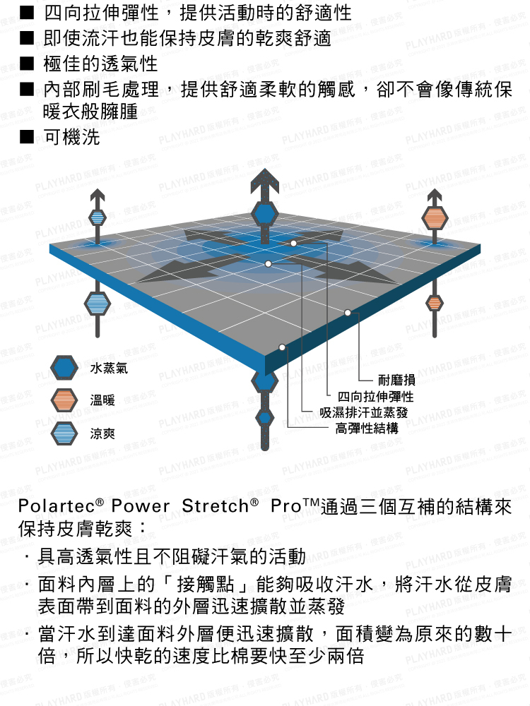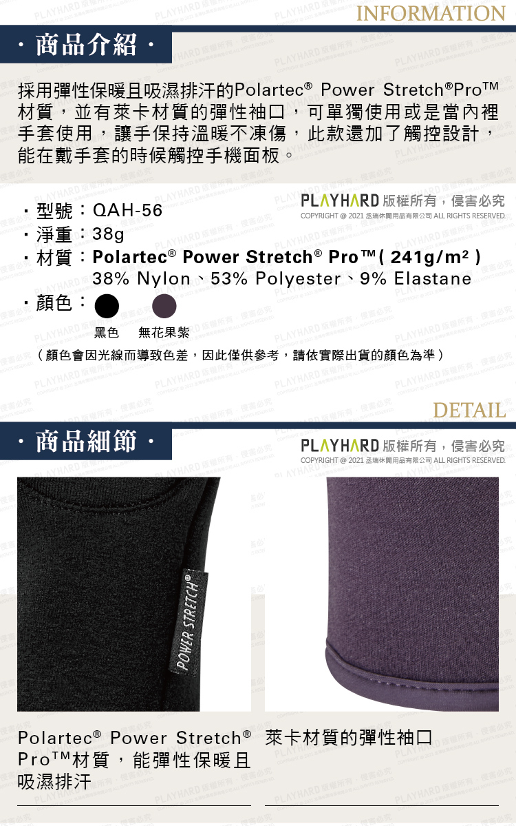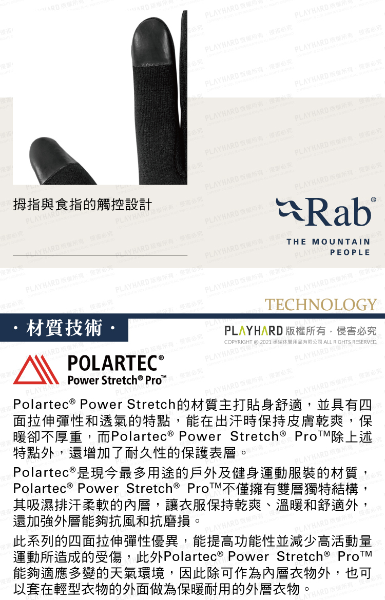 採用彈性保暖且吸濕排汗的Polartec® Power Stretch®ProTM材質,並有萊卡材質的彈性袖口,可單獨使用或是當內裡手套使用,讓手保持溫暖不凍傷,此款還加了觸控設計,能在戴手套的時候觸控手機面板。